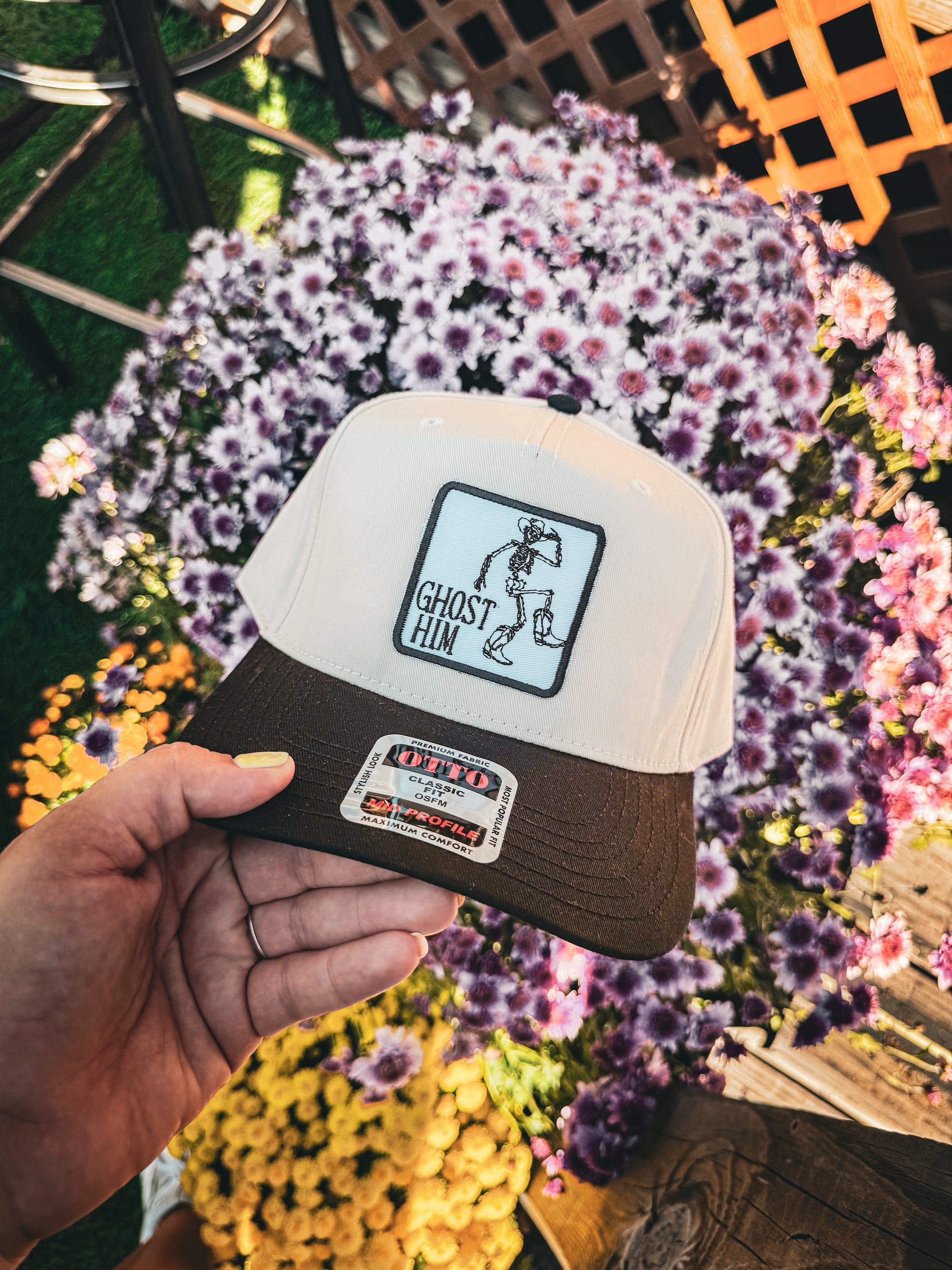 Step into spooky season with a hat that’s built to last. This classic Otto 5-panel hat features a cream crown with a deep brown bill and an embroidered “Ghost Him” patch front and center. The patch is applied using the highest-grade adhesive for maximum durability—so it stays crisp and secure through every wear.