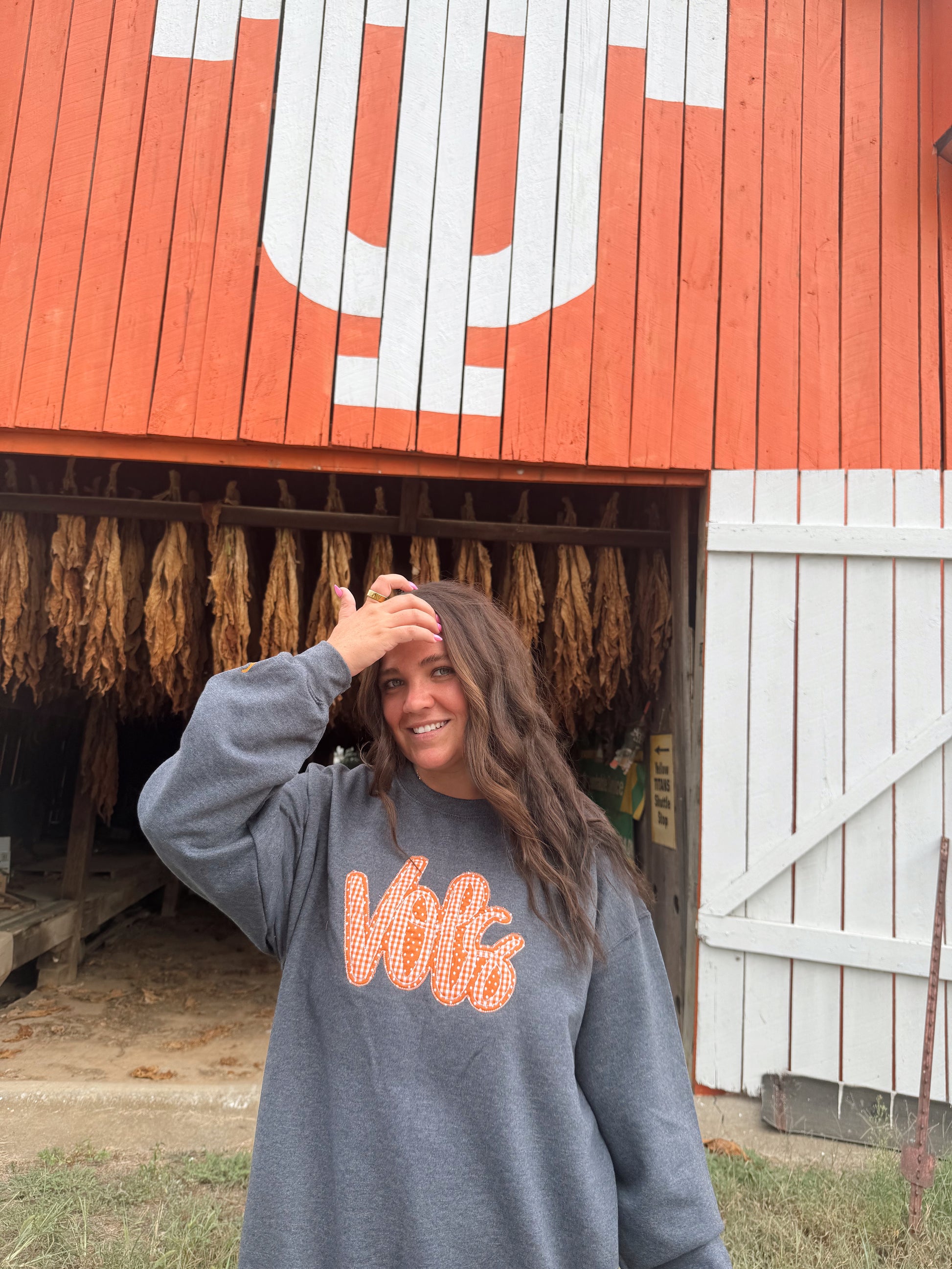 Step into game day style with our Vols Appliqué Crewneck. This cozy sweatshirt features bold, oversized Vols lettering in a standout orange patterned appliqué, giving it that perfect mix of sporty and boutique-chic. The rich charcoal and washed tones make it easy to pair with denim, leggings, or boots — whether you’re headed to Neyland or keeping it casual around town.