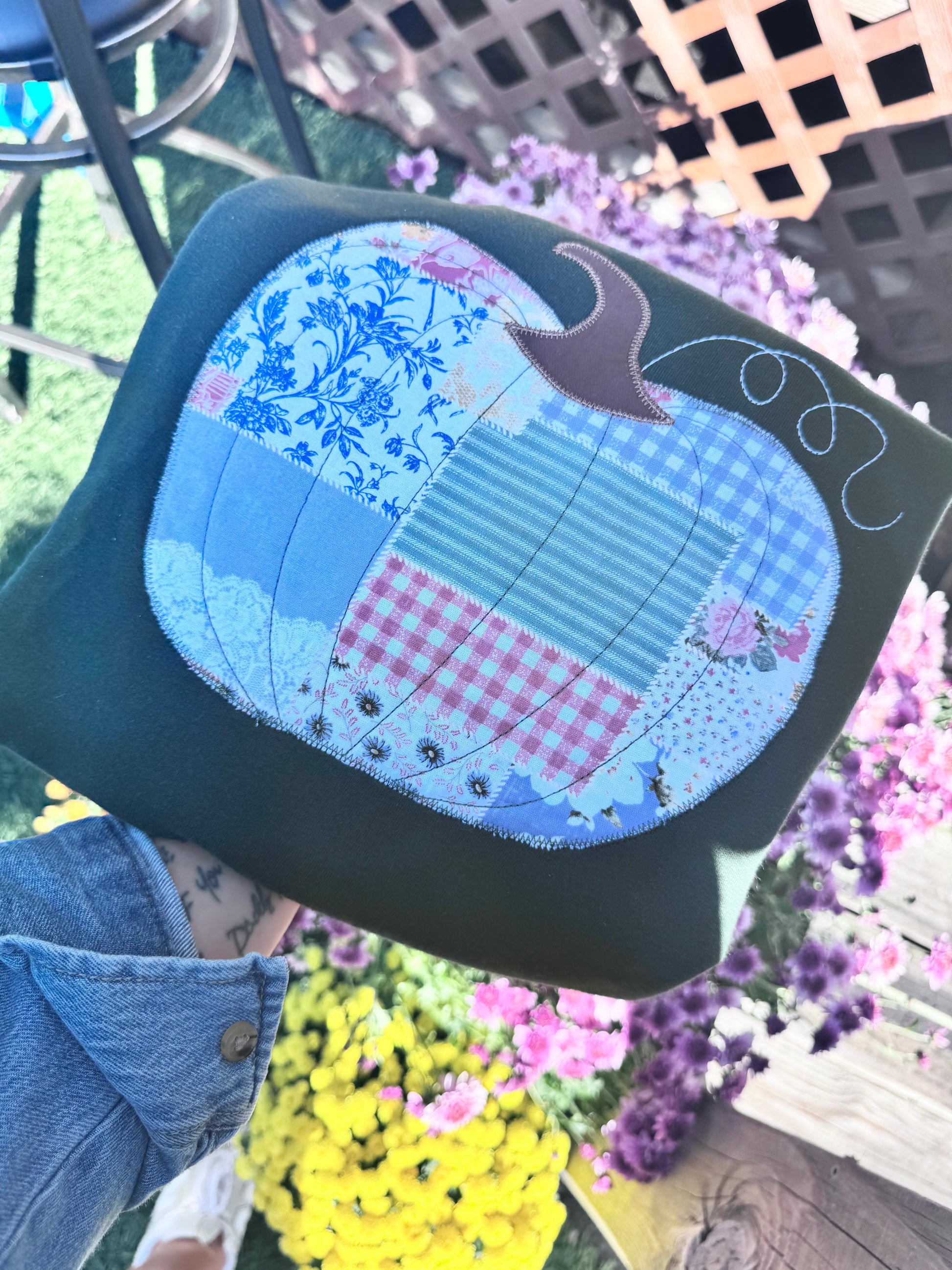 Celebrate fall in cozy style with this embroidered crewneck featuring a charming patchwork pumpkin design. Made with a mix of floral, gingham, and striped patterns in shades of blue and pink, the pumpkin has a vintage, handmade feel that stands out beautifully against the crewneck’s dark backdrop.
