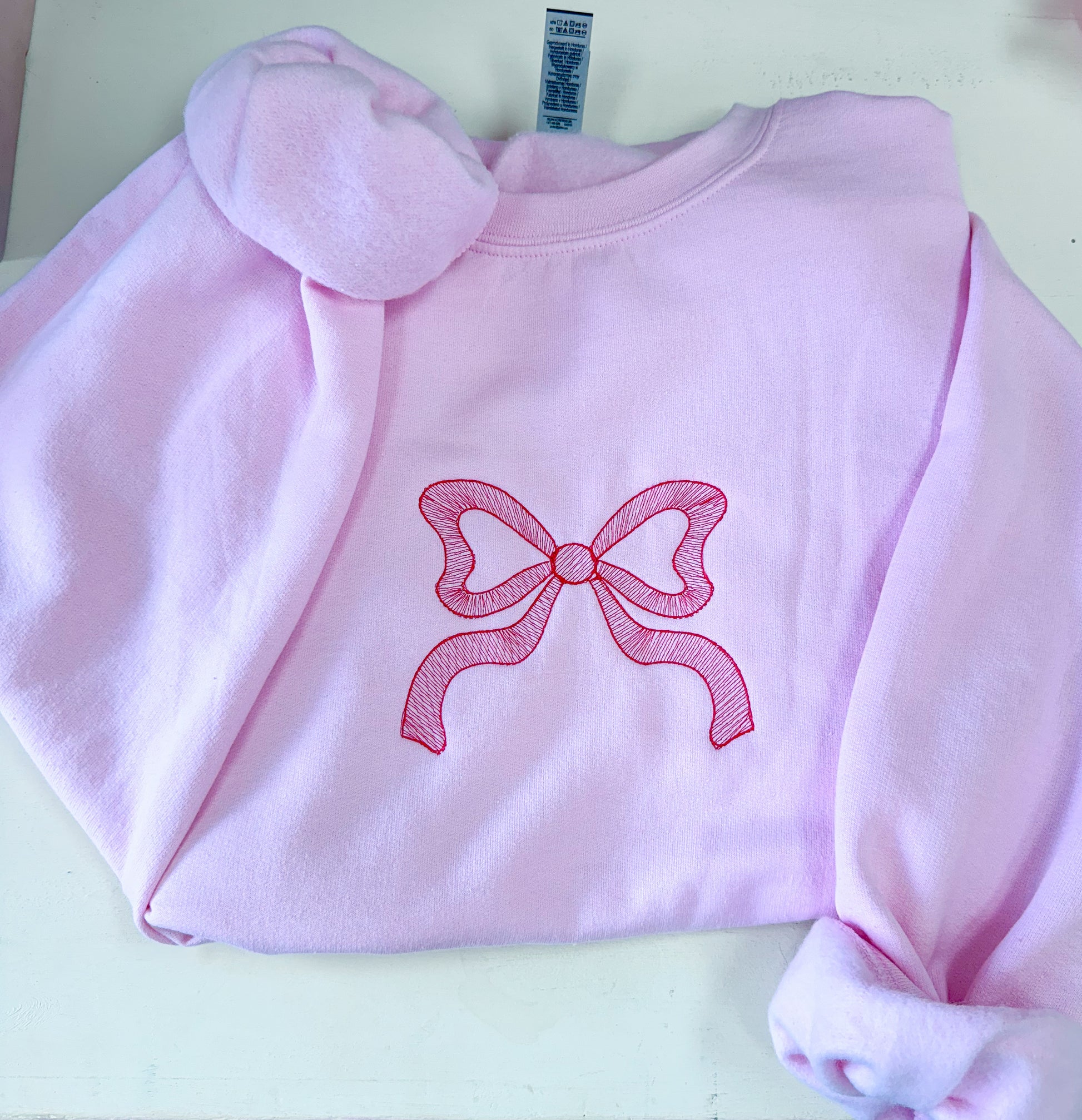 Red on pink never fails. This sweet embroidered sketch bow design on a baby pink crewneck is to die for!