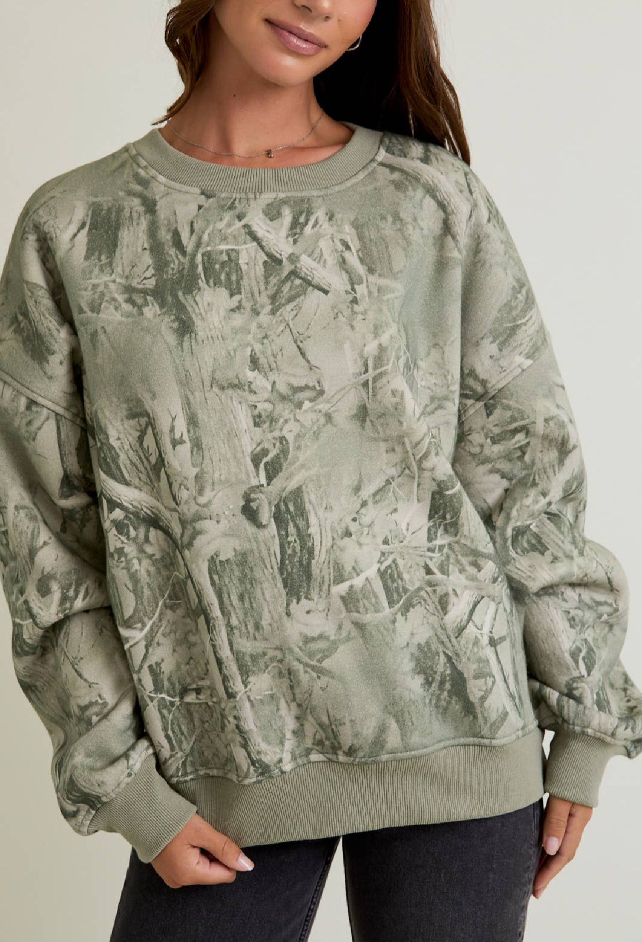 The outside features a muted sage green camo pattern — earthy, on-trend, and easy to pair with denim or leggings. But the inside? Pure heaven. Fully sherpa-lined, this crew brings unmatched coziness with a plush, warm feel you’ll want to live in all season long.